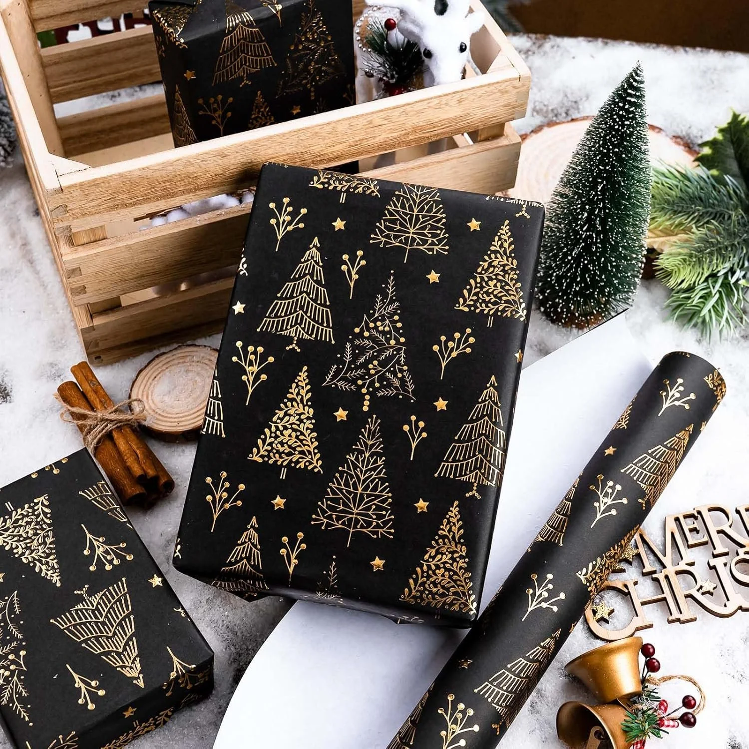 This luxurious black wrapping paper with embossed gold foil trees and stars adds a dramatic, high-end touch to your holiday gifts. The rich contrast creates a moody, elegant vibe that pairs perfectly with velvet ribbon, brass bells, and deep green accents. The roll is long and easy to work with, making it ideal for wrapping multiple presents or styling under the tree. It ties your entire moody Christmas aesthetic together with a polished, editorial look.